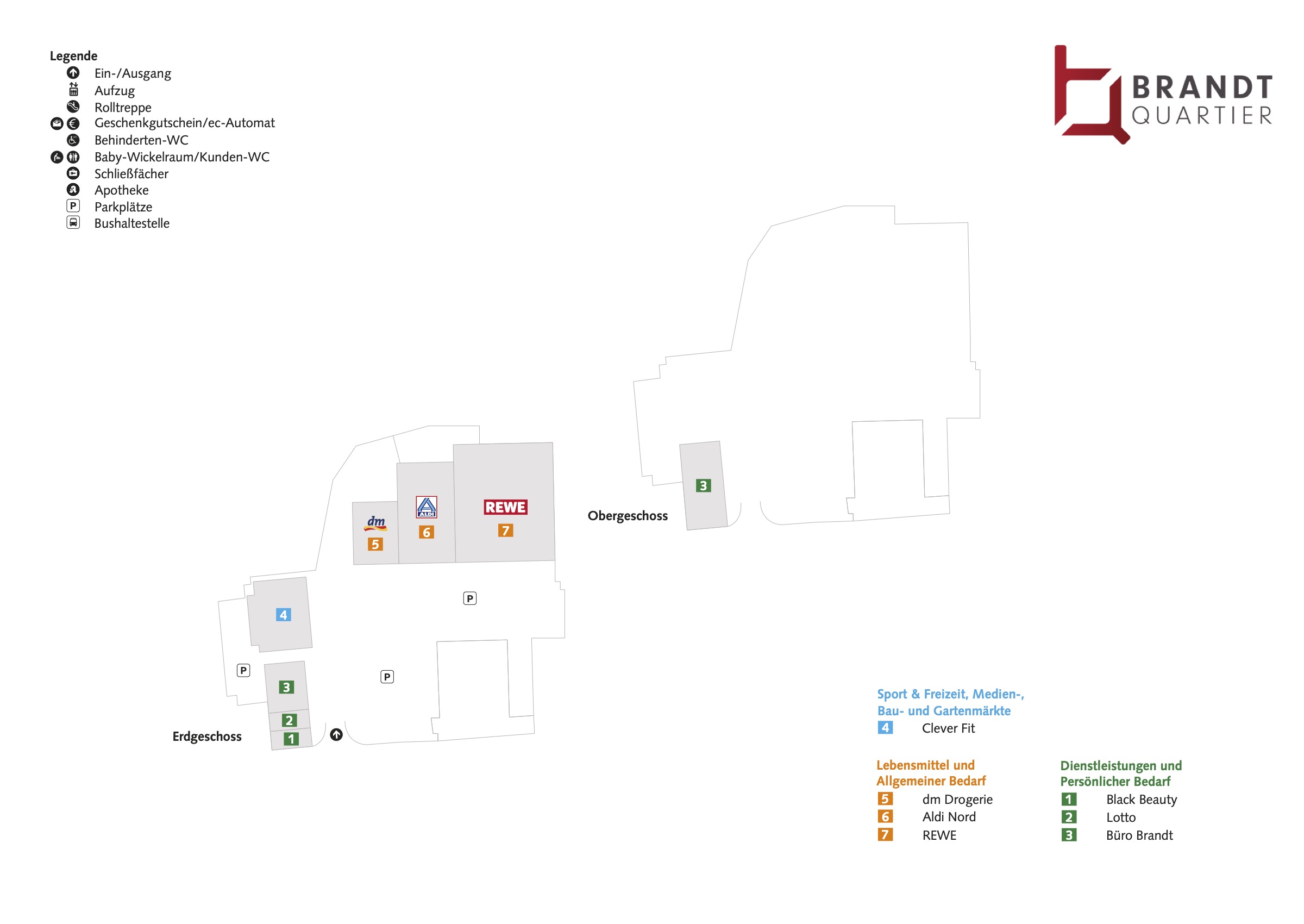 Von frischen Brötchen und Lebensmitteln über Zeitungen und Zeitschriften bis hin zum umfassenden Drogerie-Sortiment lässt das Brandt-Quartier keine Wünsche offen. Als Ergänzung dazu finden Sie ein modernes Sportstudio, das in einem aufwändig sanierten, historischen Gebäude Platz findet. Unmittelbar angrenzend vervollständigt ein Gesundheitszentrum mit mehreren Arztpraxen und einer Apotheke das Angebot.